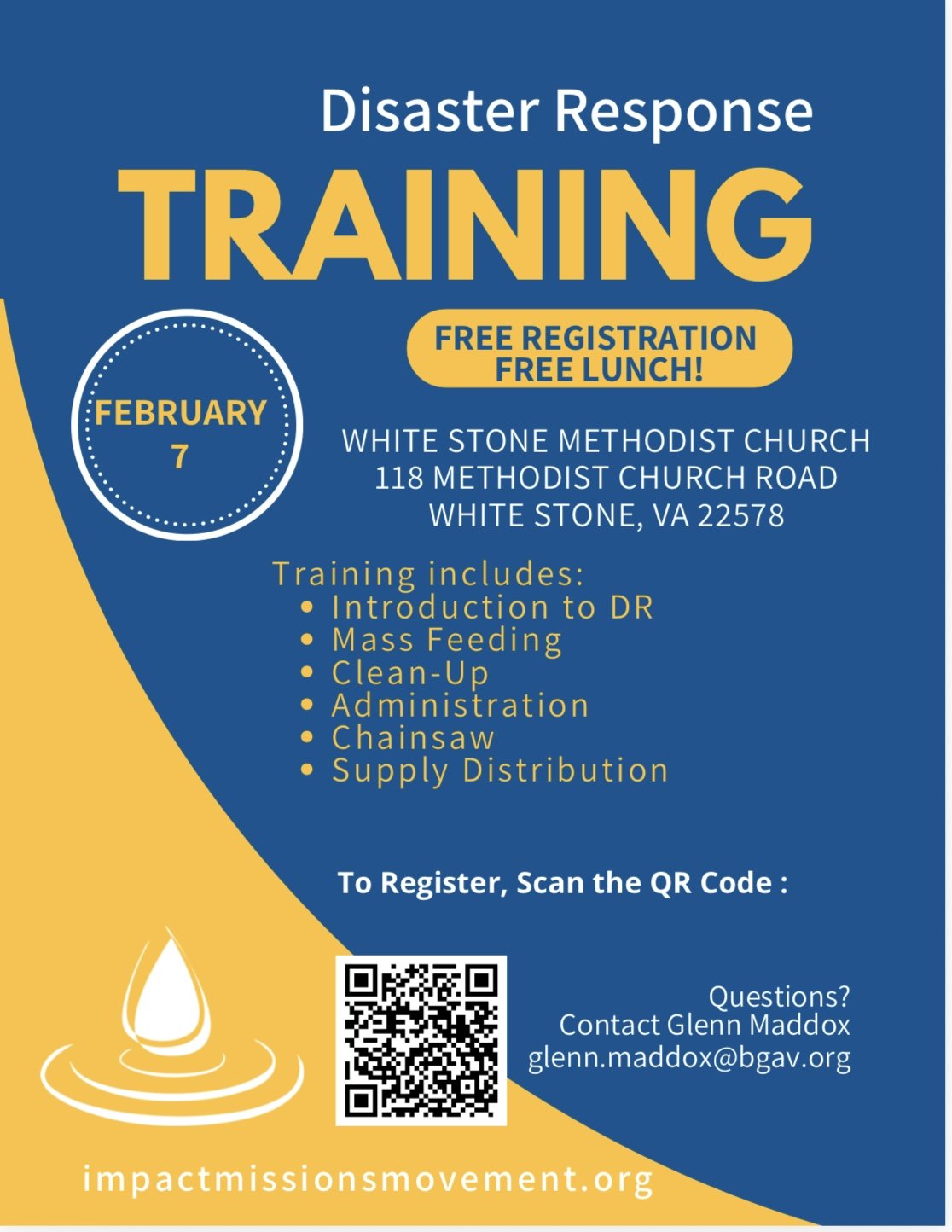 On February 7, (8-3), White Stone Methodist Church is hosting a Disaster Relief Training Day designed and taught by Impact Missions Movement. (Baptist General Association of VA). It is interdenominational in presentation, and structured in community. It's going to be a hands on, informative day with lunch included. We'll have mass feeding and clean out trailers on site. It is free of charge, but is limited in seating. Each participant must register.
